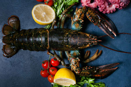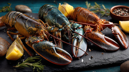 A vibrant arrangement of freshly caught lobsters displayed on a dark slate board, surrounded by lemon wedges and herbs. Ideal for seafood-themed culinary projects.