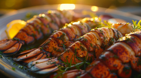 The warm glow of the setting sun reflects off a plate of grilled lobster tails