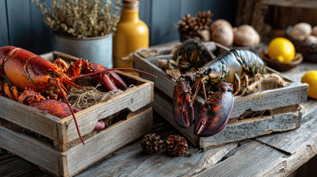 This image showcases fresh lobsters arranged in rustic wooden crates, accentuated by natural elements, ideal for culinary presentations and seafood promotions.
