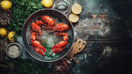 A stunning top view of a fresh lobster surrounded by herbs and lemons on a rustic wooden table, perfect for culinary enthusiasts and gourmet meal preparation.