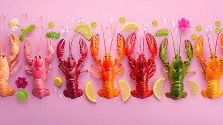 A vibrant display of colorful lobsters arranged artfully with citrus slices and botanicals on a pink background, ideal for culinary inspiration.
