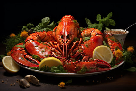 Fresh red lobster on a black background with herbs and lemon and ice. Generative AI