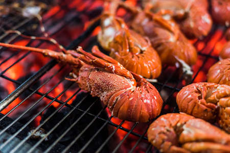Seafood preparing on bbq grill in restaurant kitchen with hot red charcoal