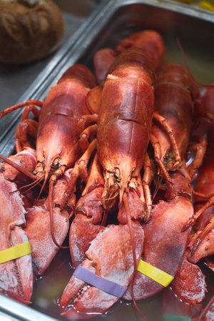 Close up of freshly boiled red lobsters on display for sale at a street food festival, ready to eat healty seafood, photo with soft selective focus
