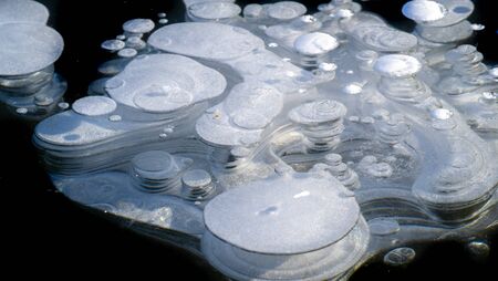 River ice, frozen air bubbles in water. Methane bubbles form in the organs of the Water mass when dead organic matter (leaves and animals) enters and sinks to the bottom