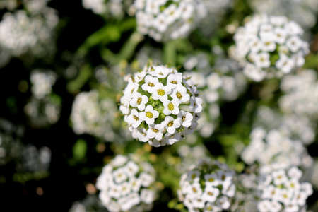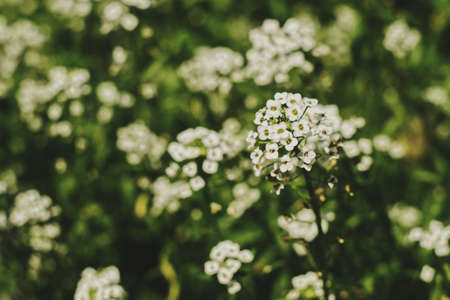 Many white small beautiful flowers Alyssum with tiny petals on small green bush blooms in summer in the light of sun