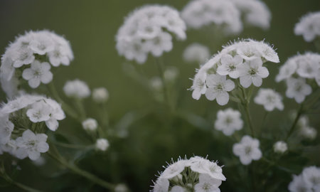 White small garden flowers close-up in the garden with blurry background and bokeh
