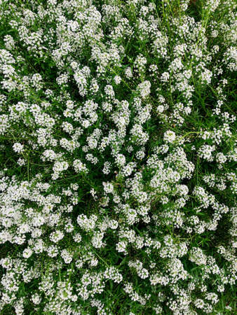 Close up of Sweet Alyssum or Alyssum Maritimum white flowers. Carpet of Snow plant white floral background