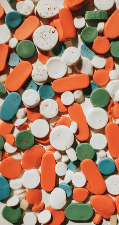 Close-up view of a collection of colorful, geometric shapes, in varying tones and sizes. The shapes are arranged densely, creating a vibrant and visually interesting design.