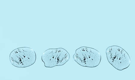 Swatch of cosmetic liquid drops on blue background top view. skincare product