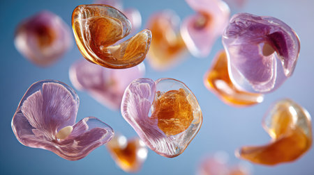 This image showcases numerous abstract shapes in varying shades of orange and purple. The translucent forms appear to float against a soft blue background, creating a sense of depth and movement. The composition utilizes soft lighting and a shallow depth of field. It would be suitable for various commercial or editorial applications.