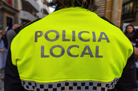 Back view of a police with the text in Spanish Policia Local that means local police maintaining the order in the streets