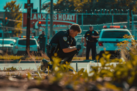 A police officer kneels to collect evidence in a bustling urban area, surrounded by vehicles and colleagues, as tension mounts during the daylight investigation.