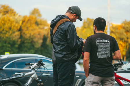 Moscow, Russia - SEPTEMBER 9, 2013: Two men with bicycles stand talking to each other against the background of cars and Sunny woods. Rear view