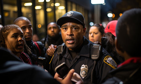 A police officer in uniform speaking to a diverse group of individuals in a public setting.