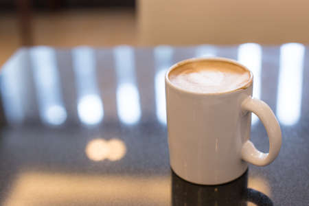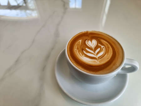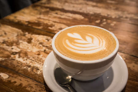Sideway shop coffee, a cup of hot latte art coffee on the table.