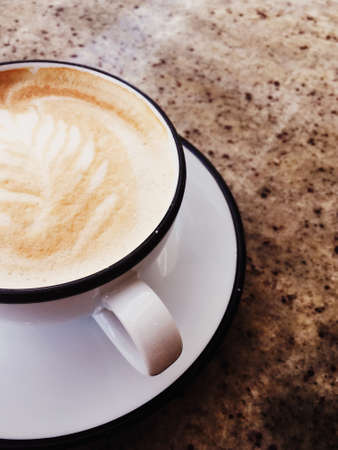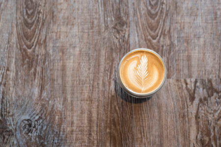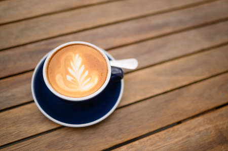 A cup of hot latte, cappuccino or espresso coffee with milk foam on a rustic table, view from top. Milk foam in shape leaf tree on top of latte art from professional barista artist