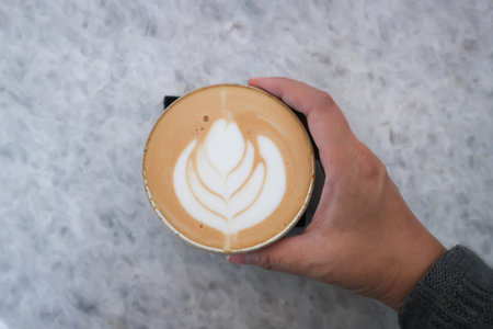 A closeup shot of a person's hands holding a hot cup of cappuccino with beautiful foam art on it