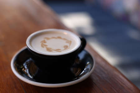 Hot art Latte Coffee in a cup on wooden table and Coffee shop blur background with bokeh image.