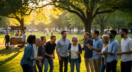 A diverse group of multi-generational friends and family are standing together in a park, laughing and enjoying a conversation. The scene is bathed in warm, golden sunlight, conveying a sense of community, happiness, and connection.