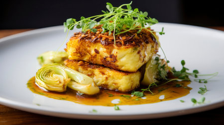 An exquisite gourmet dish featuring a crispy fish fillet topped with vibrant microgreens and delicate shiso, served over a flavorful sauce in an elegant presentation.