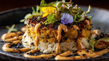 This gourmet dish showcases expertly plated rice topped with a vibrant mix of herbs and colorful edible flowers, complemented by a rich sauce.