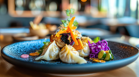 A beautifully presented plate of gourmet dumplings garnished with vibrant vegetables, showcasing culinary artistry in a modern restaurant setting.