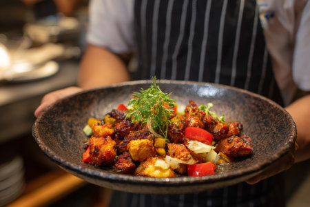 Hot dish with meat and vegetables in a white plate. The waiter carries the dish in the restaurant.