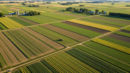 An expansive aerial view showcases a vibrant patchwork of agricultural fields in various shades of green, yellow, and brown, with a tractor actively...
