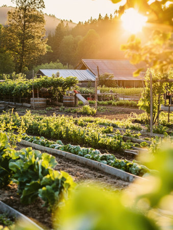An idyllic farm scene bathed in the golden light of dawn with rows of fresh vegetables in the foreground