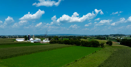 Lush green fields stretch out in a rural landscape under a bright blue sky filled with scattered clouds. A farm is visible in the distance, showcasing agricultural life and serenity.