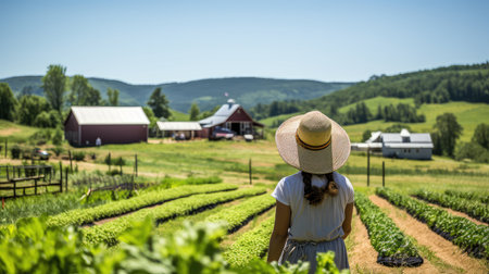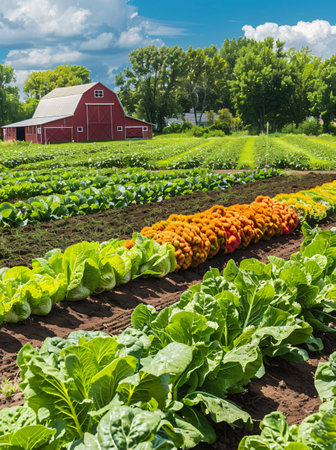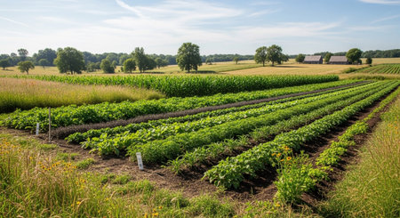 A vast organic farm meticulously arranged rows of vibrant green vegetables and tall corn stalks under a bright blue sky.