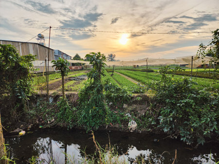 Warm sunlight streaming through trees illuminated cultivated rows of vegetables thriving in a farm field, with a large greenhouse silhouetted against the vibrant sunset sky