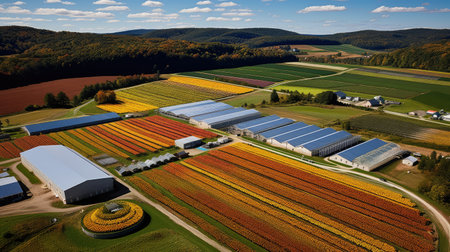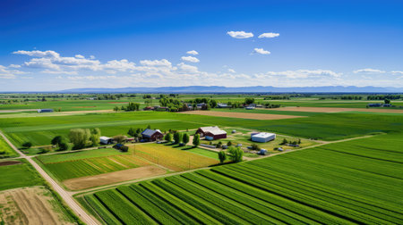 An extensive farm with silos, barns, and rows of vegetables and grains Generative AI