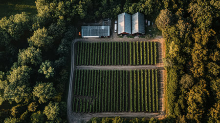 Discover a breathtaking aerial view of a vibrant vineyard nestled amidst dense trees, showcasing neat rows of grapes flourishing in a peaceful rural landscape.