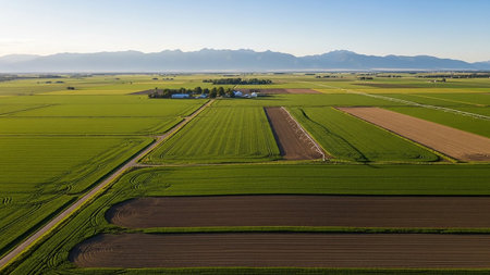 Wide aerial view of a rural agricultural landscape featuring varied green and brown fields, a road, irrigation system, and distant blue mountains.