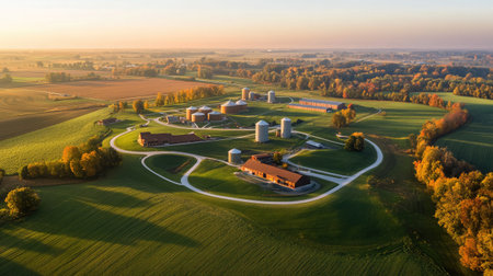 Green fields surrounding an industrial livestock farm, with large barns and silos in the distance, illustrating the integration of farming and agriculture