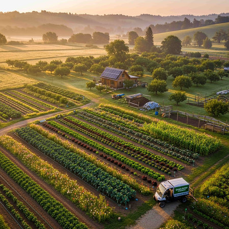 Fresh organic produce is being prepared for delivery amid a vibrant farm landscape bathed in warm sunlight, showing natures beauty and tranquility.