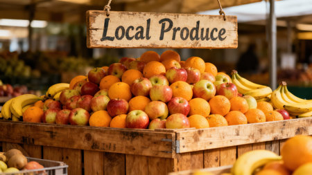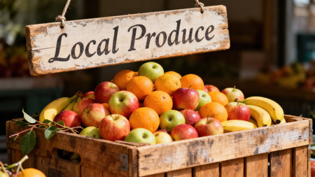 Wooden crates display colorful fruits and vegetables at an outdoor farmers market, inviting shoppers to explore fresh produce in a vibrant and lively setting