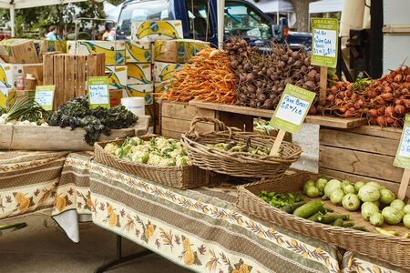 Boulder, Colorado - August 10th, 2019: Colorful display of carrots, beetroots and other vegetables for sale at a Farmers Market