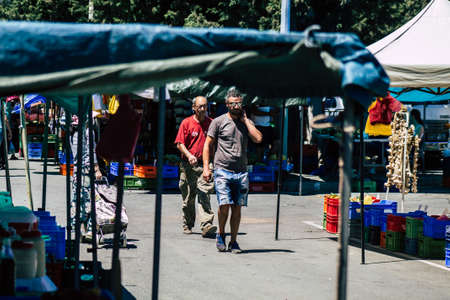 Limassol Cyprus June 13, 2020 Portrait of unidentified people with a face mask to protect themselves from the coronavirus shopping at the Limassol market in the morning