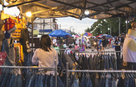 Unidentified people walking and shopping at the street market in Bangkok, Thailand.