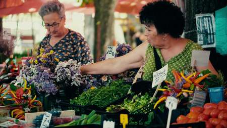 PULA, CROATIA - AUGUST 4, 2017. Female vendors at local farmers market
