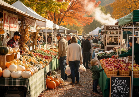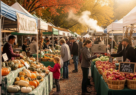 A bustling outdoor farmers market on a crisp autumn day with vibrant produce and happy shoppers