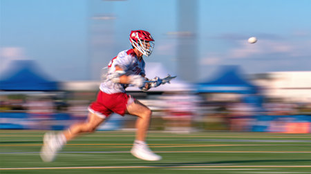 A determined lacrosse player in red gear races across the field, focused on scoring as spectators cheer in the background under a clear sky.