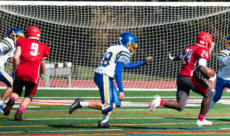 Defence chasing and trying to tackle the running back during a high school football game on a turf field