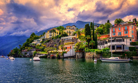 Dramatic sunset over Ascona, a popular resort town on Lago Maggiore, Switzerland