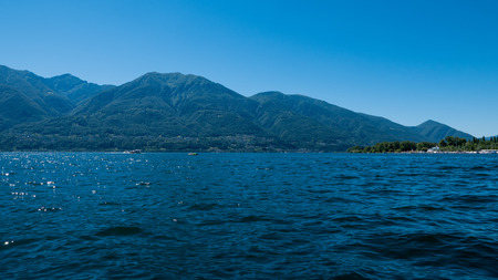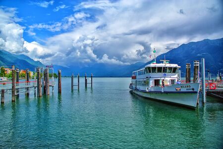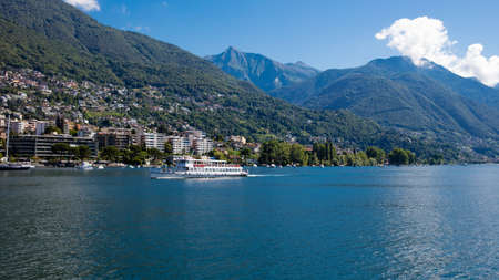 Lago Maggiore lake in Ascona, Ticino with Ferry boat