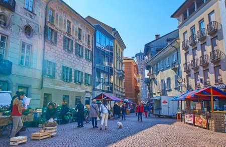 BELLINZONA, SWITZERLAND - MARCH 19, 2022: The historical square becomes a crowded place during Saturday Farmer's market, on March 19 in Bellinzona, Switzerland