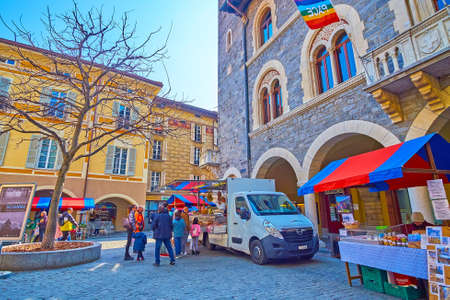 BELLINZONA, SWITZERLAND - MARCH 19, 2022: The central square Piazza Collegiata is occupied with farmer's stalls of Saturday Market, on March 19 in Bellinzona, Switzerland